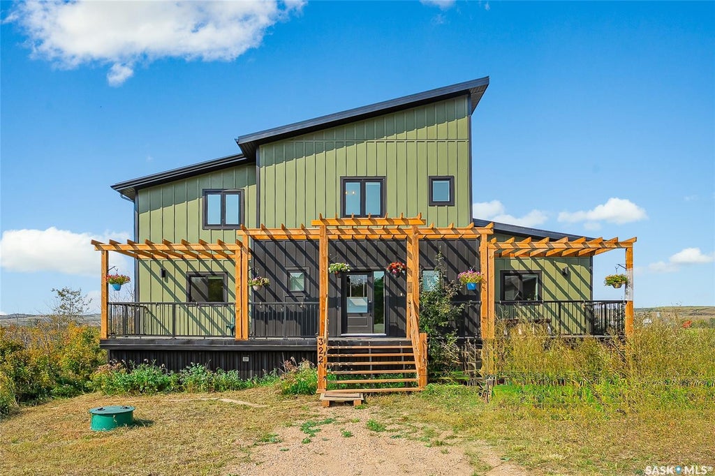 Unique opportunity to own this Energy Efficient built home in Sarilia Country Estates on the RIVER BANK!! Amazing RIVER views from the expansive west facing windows from both levels!! No expense spared to make this a low maintenance stylish home with many natural materials used. You'll be greeted with a oversized front foyer where you can see right through the windows to the river bank views! Amazing open concept with 9ft ceilings on the main floor. Custom made "Douglas Fir" staircase and landing along with the 2 fireplace mantels + front entrance seating bench. Custom "Kitchen Craft" cabinets in the kitchen. Uppers are 42" tall complete with granite sink, pantry with pull outs, coffee bar, tiled back splash, quartz counter tops including the island. Appliances included (induction stove) Handy laundry room located next to the kitchen. Electric fireplace in the living room. There is access to a 48 ft west facing deck off the dining room and Primary bedroom. Perfect spot to watch those amazing Saskatchewan sunsets. Another 48ft Composite deck in the front. Main floor Primary bedroom features a walk-in closet and a 3 piece ensuite. The 2nd level has 1200sqft with Huge family room with impressive vaulted ceilings + electric fireplace, surround sound and a wet bar. 2 nice sized bedrooms and a 4 piece bathroom. Custom blinds including black out blinds in the bedrooms. Cork flooring and Custom natural 6" Pine baseboards and 4" Pine trim throughout. Solid pine doors. SOLAR heated home with electric boiler and water heater (8 kilowatts) Unique setup with solar panels on the south wall. In-Floor heat on the main floor and European heat radiators on the 2nd floor. 1800 sqft crawl space which is 4 1/2 ft high also with in-floor heat. Hardy Board - board/batten siding. Exterior walls 6" thick white Styrofoam with silver reflective on both sides. Metal roof has 10" of insulation. "Durabilt" Windows and doors (triple pane) 1760 gal poly septic tank. 2-1000 gal water storage tanks.